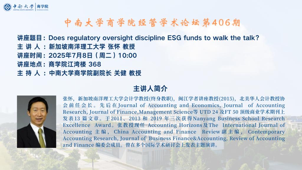 伟德国际1949官网经管学术论坛第406期——新加坡南洋理工大学 张怀 教授