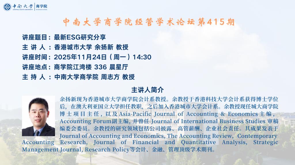 伟德国际1949官网经管学术论坛第415期——香港城市大学 余扬新 教授