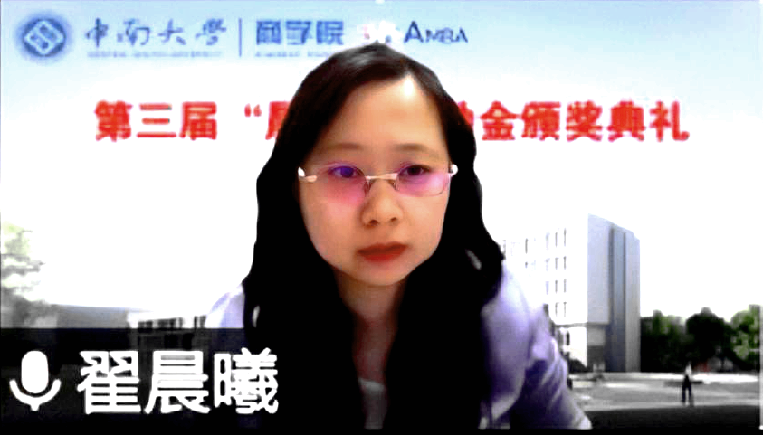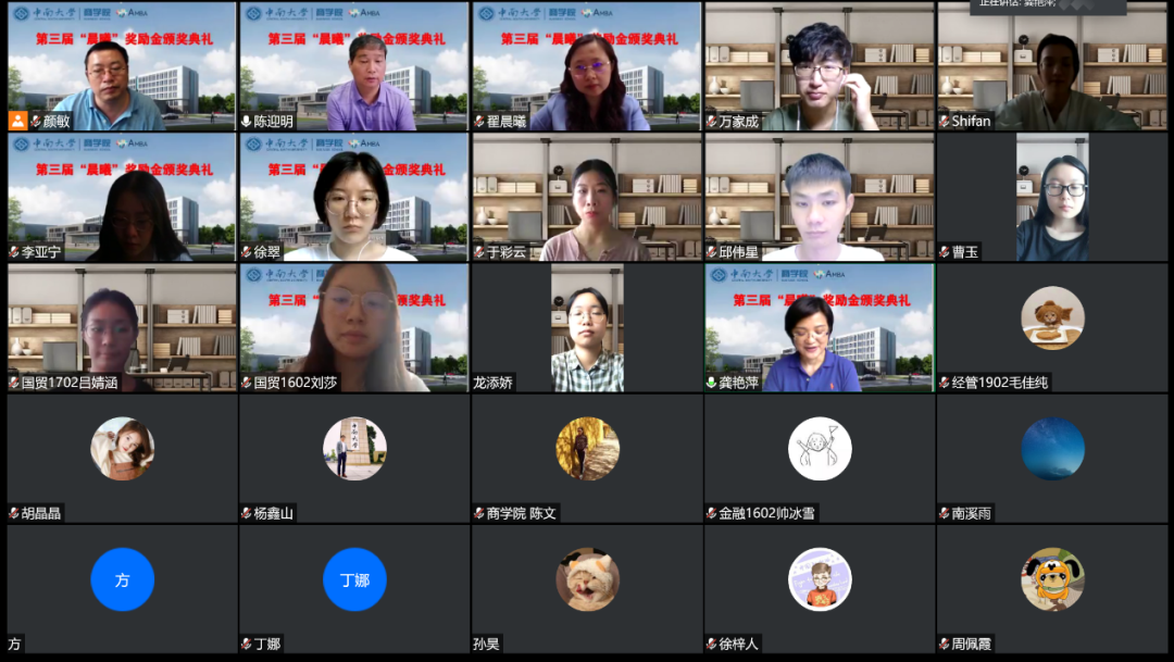 6月3日下午,伟德国际1949官网第三届“晨曦”奖励金颁奖典礼以线上会议的形式顺利举行。“晨曦”奖励金设立者、天风证券副总裁、天风国际董事局主席、恒泰证券联席总裁翟晨曦女士受邀出席,伟德国际1949官网龚艳萍院长出席并讲话,学工办与校友办教职工,获奖学生及各年级学生代表,共110余人参与。本次颁奖典礼由院党委陈迎明副书记主持。
