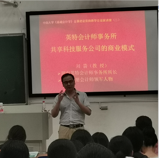 随后,李世辉教授对刘箭教授进行了介绍,刘箭教授为本科生做了题为 “英特会计师事务所共享科技服务公司的商业模式”的主题讲座,刘教授首先对“共享”这一当前流行的概念进行了介绍,然后就英特会计师事务所共享科技服务公司的商业模式进行了详细阐述,主要包括科技公司的客户体系、公司的核心能力和价值及企业的盈利方式等。