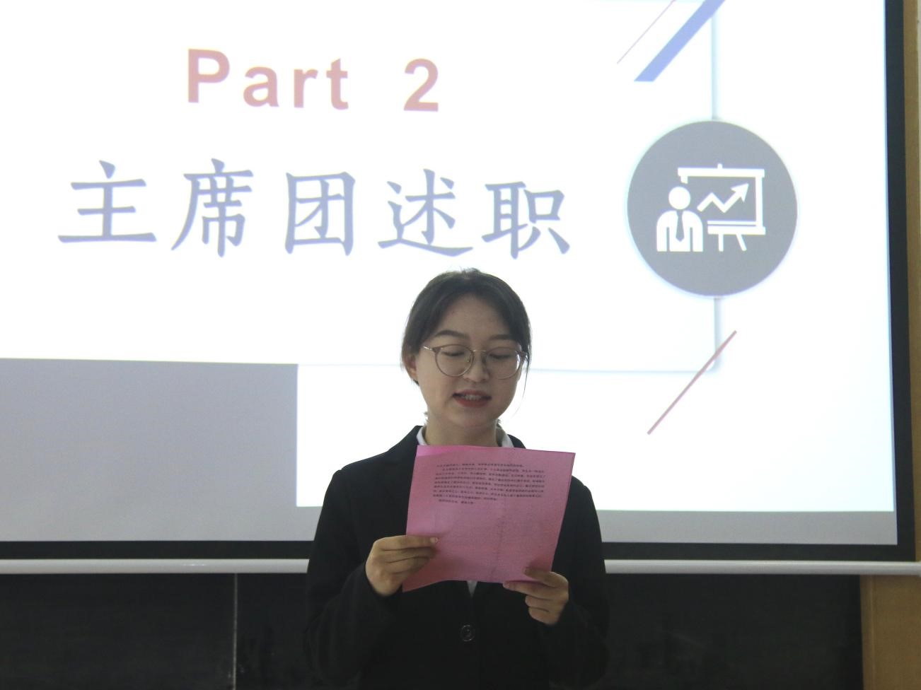 伴随着热烈的掌声,团委副书记杨凯翔、陈彦漪,执行主席宾奕、胡翊凡、崔旭及陈田子、韦诗熠等现任部长团成员接连上台述职。他们以各自负责的工作领域为基,总结亮点、指明问题、提出方案,并对团委、学生会的未来发展表达了美好期许。
