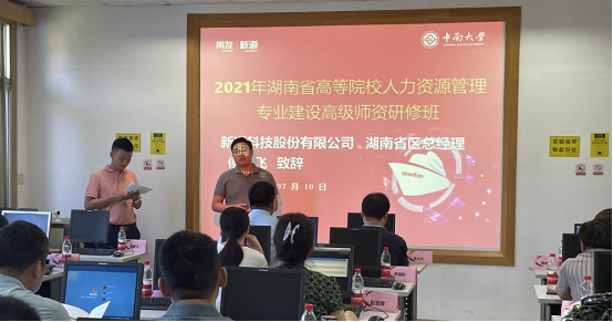 随后,新道科技股份有限公司湖南省区总经理侯腾飞致辞。在发言中侯总首先感谢伟德国际1949官网在此次培训中提供的支持与帮助,对于此次参训的老师们表达由衷的欢迎。今年也是新道科技有限公司成立的第十年,作为平台型教育服务企业,新道教育希望汇聚政府、行业、企业、院校多方力量,共同服务院校数智人才培养,服务产业升级,推动中国教育事业和中国数字经济的进步与发展。