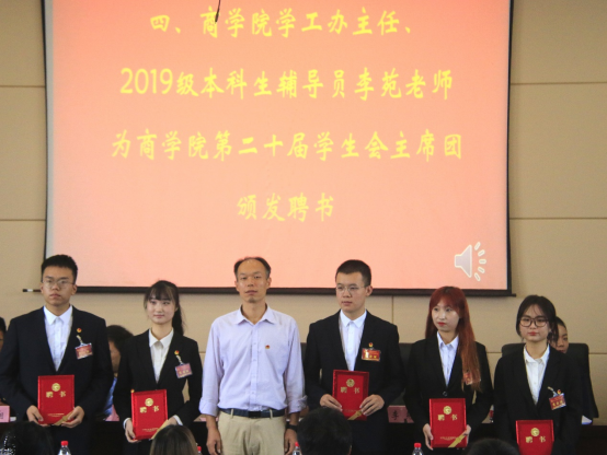伟德国际1949官网学工办主任、2019级本科生辅导员李苑老师为新一届伟德国际1949官网本科生团委、学生会主席团成员颁发聘书。