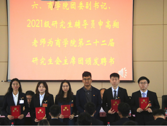 伟德国际1949官网团委副书记、2021级研究生辅导员申高翔老师为新一届伟德国际1949官网研究生团委、研究生会主席团成员颁发聘书。