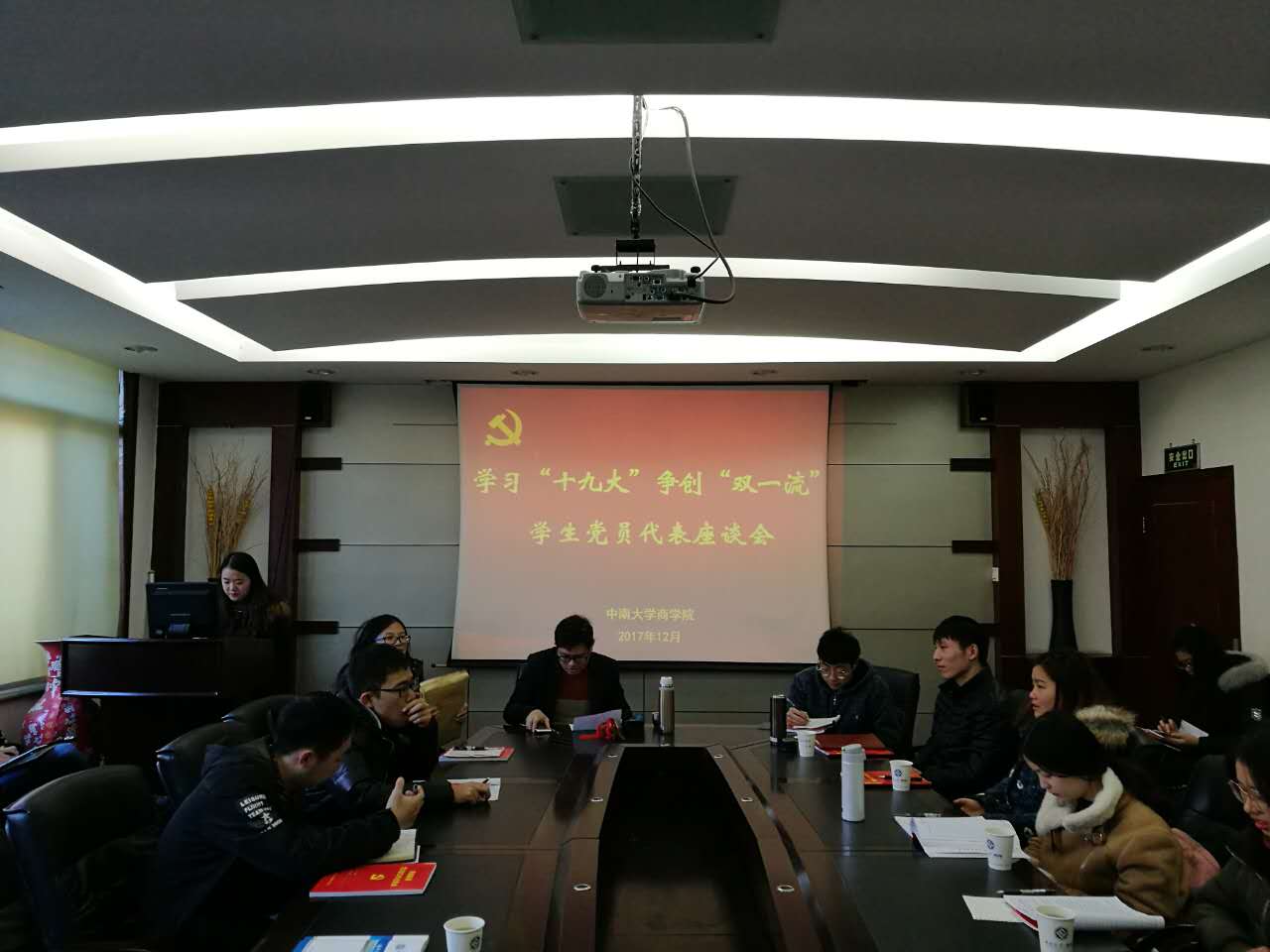 2017年12月19日周二下午三时,伟德国际1949官网学习“十九大”精神党员代表座谈会在管理楼220会议室召开。本次座谈会由学生党员代表谢玲主持,伟德国际1949官网党委书记游达明教授、研究生辅导员胡维、蒋宁老师以及各个学生支部党员代表参加了座谈会。