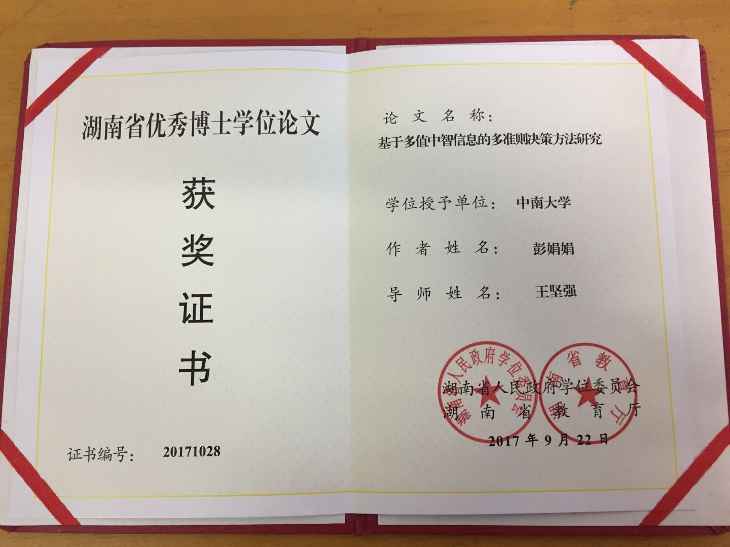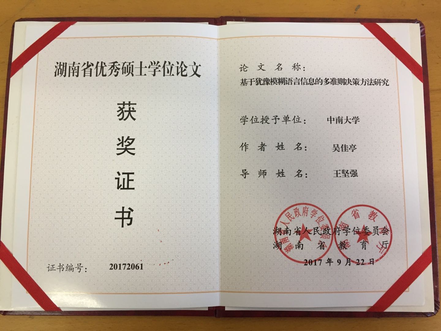 2017年12月学校下发了《2017年湖南省优秀博士、硕士学位论文》证书,此次全校荣获2017年湖南省优秀硕士学位论文46篇、优秀博士学位论文18篇,我们三名研究生的学位论文名列其中,可喜可贺。这三名研究生分别是王坚强教授指导的彭娟娟博士、吴佳亭硕士以及刘爱东教授指导的曾辉祥硕士。