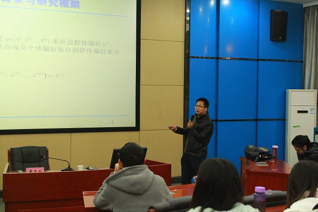 本次学术报告董玉成教授首先做了题为“群体决策的语言个体性与共识过程”的学术报告,向在场的老师和学生分享了群体决策的研究背景与框架、语言个体性问题研究、最小信息损失共识过程以及进一步的研究等内容。然后,董玉成教授又做了题为“舆论演化的网络共识结构与不确定机制探讨”的报告,主要从舆情的研究背景、基于DG模型的社会网络共识结构和基于HK模型的不确定观点演化机制三个方面进行了学术探讨。研究结果表明,通过增加最少信任连接能促进群体共识并且不改变个体原始观点;另外,在观点的演化过程中,观点不确定个体和观点的不确定程度会对舆情演化产生影响。