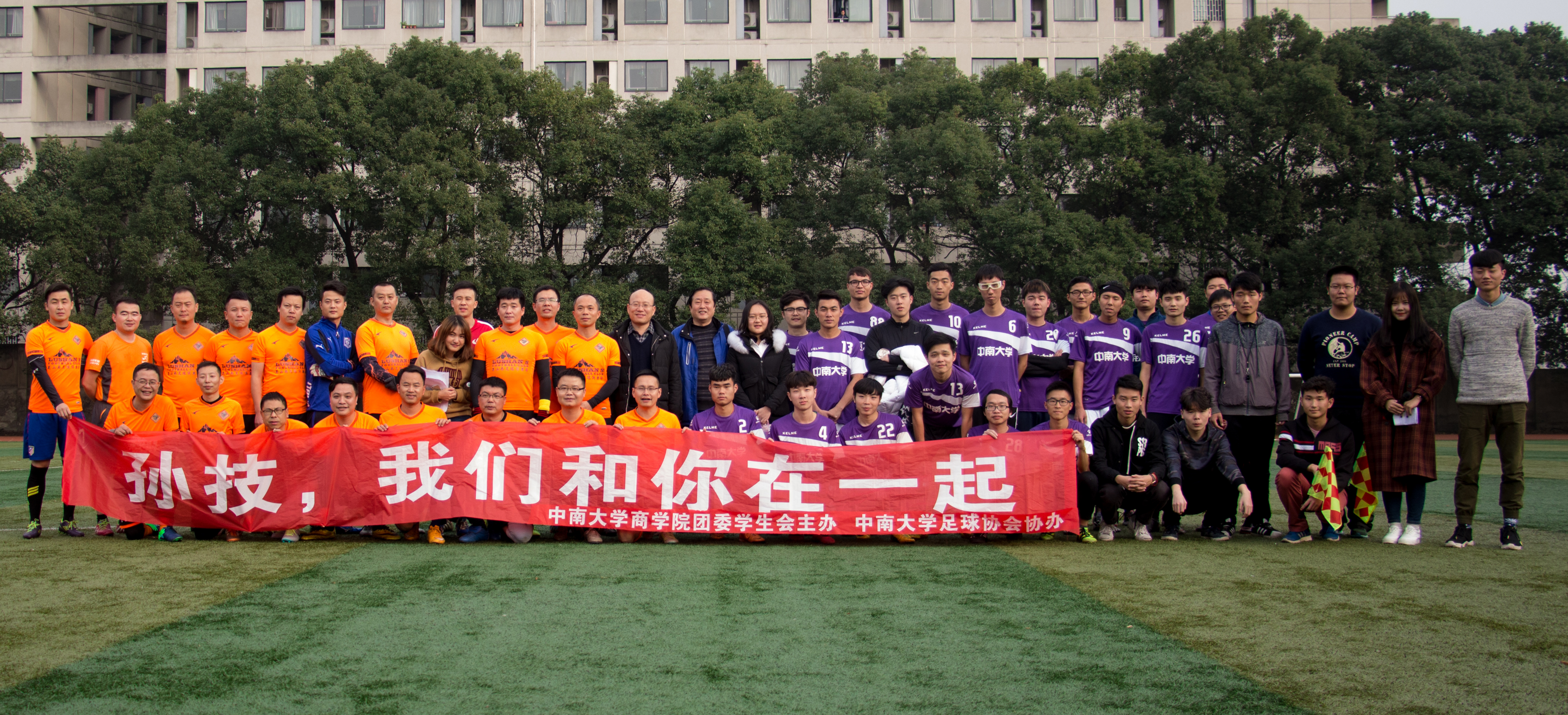 球赛开幕,主持人王雪饱含深情地介绍了信管1302班孙技同学殷勤求学的经历、光明美好的未来以及对他现处病魔煎熬之中的关心,表达了对麓山南队的“为爱而战”的诚挚感谢。冬日暖阳笼罩球场,两支球队、领导老师和工作人员在赛前进行了合影。合影时他们高喊:“孙技,加油”,不仅点燃了比赛的热情,更是表达了对孙技同学的殷切关怀和鼓励。