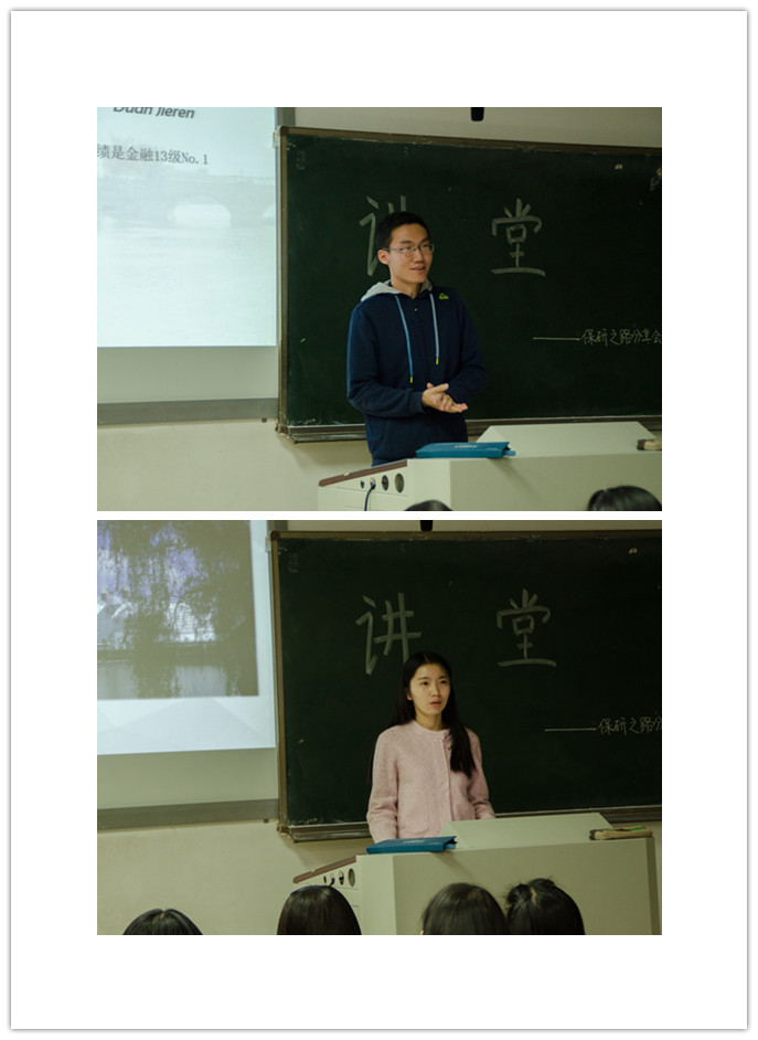 11月4日晚七点,团学会学术部举办的主题为“保研经验交流”学长讲堂活动在新校区A座104教室成功举办。本次讲座的两位主讲人分别是信息管理专业13级、推免至北京大学管理学硕士的丁灵和金融专业13级、推免至清华大学金融学硕士的段仁杰。讲座内容充实有力,现场座无虚席。