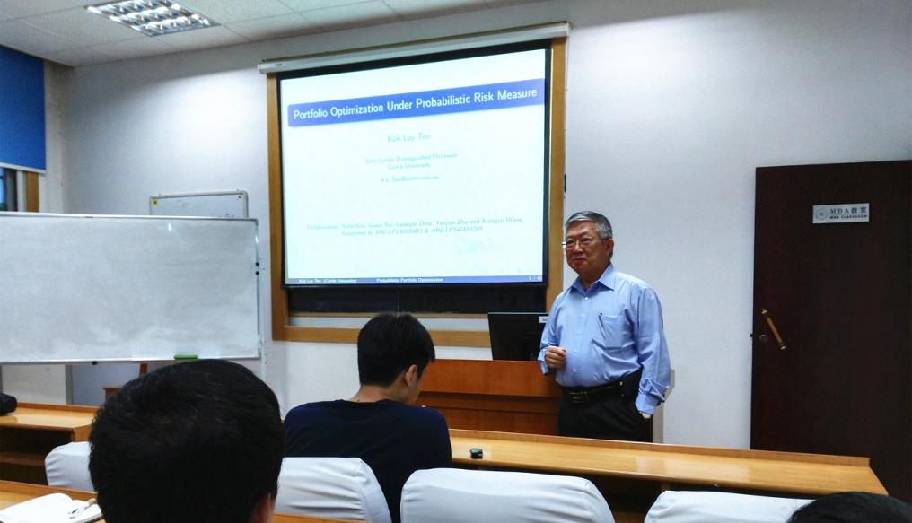 4日的讲座以“Portfolio Optimization Under Probabilistic Risk Measure”为题。Kok Lay Teo教授分别针对单周期与多周期考虑投资风险的投资组合优化问题,讲解了两种不同情形下最大化预期投资收益且最小化个人最大投资风险的双目标优化模型的构建、求解与分析。讨论答疑环节,Kok Lay Teo教授细心解答了学者们的各种问题,指出了此投资组合选择方法的新颖性与灵活性,并与大家探讨了此方法在经济管理其他领域应用的可能性。