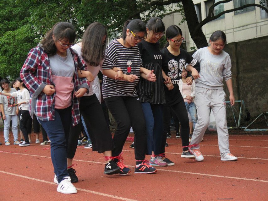 活动共由六个部分组成,会计三个班班长支书各带一队,队员采用随机分组的形式进行比赛。活动期间各组队长和组员一起排兵布阵,各组在体力和脑力上进行较量。在“背媳妇跳绳大战”中,同学们感受到了指压板的“折磨”;通过“圈圈水汪汪”,同学们有了天旋地转的实感;“我们都是多足兽”让各组队员心连心,携手走过终点;“猜猜'我'是谁”更是对各组默契的考验;“坐地起身”则是检验了队员们的柔韧性和协作精神;由于时间问题,没有进行“盲人方阵”的比赛,但本次素质扩展活动在同学们的欢声笑语中圆满结束。