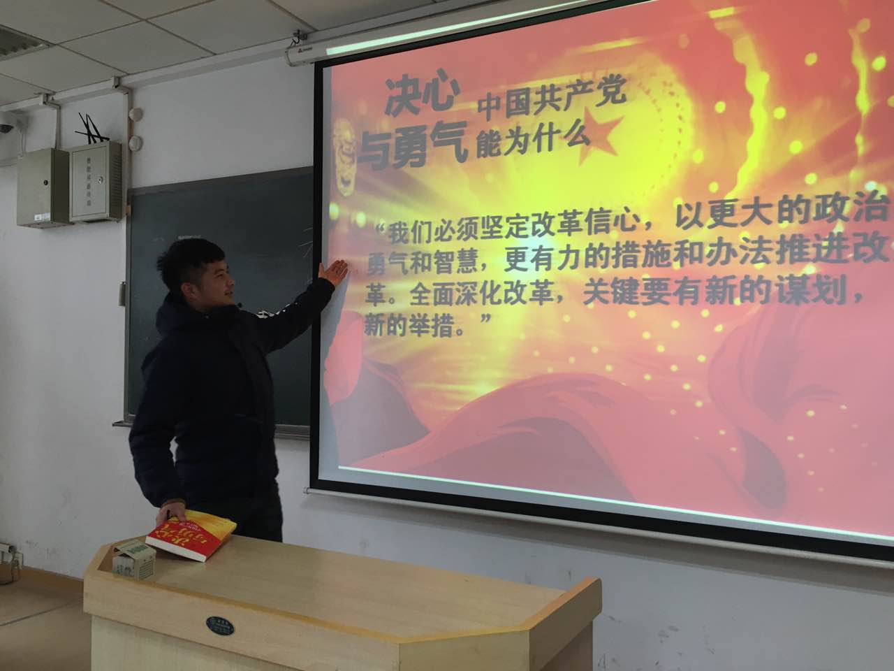由中央党校党史教研部主任谢春涛编写的专著《决心与勇气》支部一书,支部每位同志已经专心研读半月,全书分为九个部分,由九名同志分别重点讲述自己的读书心得体会。每位同学的讲述和笔记都对我国全面深化改革进程的方方面面有了鞭辟入里的分析,都能够结合自身学习生活实际谈对党对祖国深化改革的理解和支持。最后,张福同志巧妙结合专业课所学知识,利用其时而幽默风趣,时而慷慨激昂的话语,打动了每一位同志,获得比赛第一名。