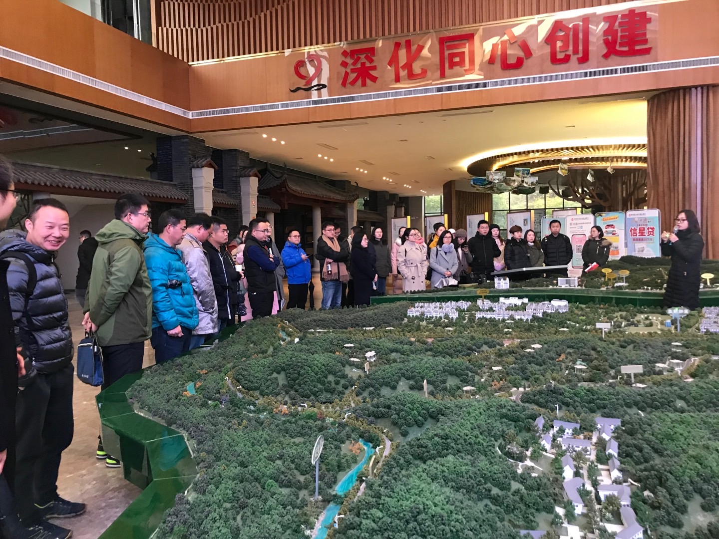 上午10点,在接待中心,傅教授与同学们在听取完周蜜女士对小镇整体规划以及产业发展情况介绍后,带着强烈的好奇心,冒着寒风细雨来到星空木屋观景台眺望了小镇全貌,并先后考察了地球仓、樱花谷、村企共建特色党建、田汉文化园等产业和文旅项目,同学们对美丽乡村+生态社区+特色产业的浔龙河模式纷纷赞叹不已。