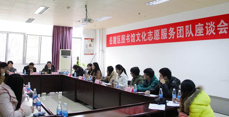1月10日下午两点半,岳麓区图书馆召开文化志愿者服务团队座谈会,以落实2015年文化志愿服务工作的安排部署。岳麓区文体新局局长王洪出席了会议,参加会议的有岳麓区图书馆馆长杨娟、副馆长张婷婷、我们团委常务副书记陈文老师、文化志愿者团队丁灵同学及周边高校文化志愿者团队代表。