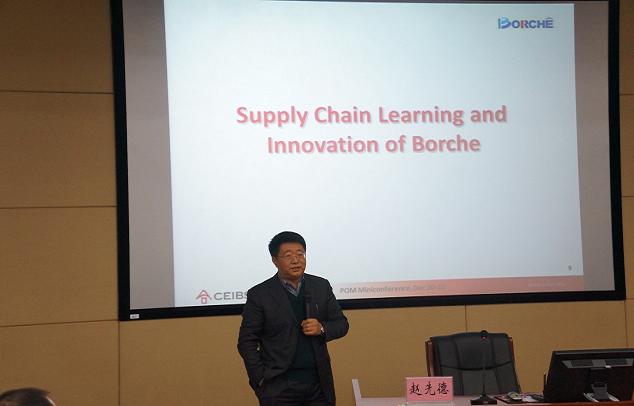 赵教授首先以Borche公司和HomeKoo.com为例,讲述了供应链合作学习以及企业网络平台如何影响企业的创新能力,然后深入阐述了如何从这些案例中的实际问题,引申到学术研究的科学问题,以及如何构建理论模型,收集数据,从而完成一篇高质量的学术论文的全过程。赵教授的讲座将企业实际案例与学术研究相结合,引起了老师和同学们的极大兴趣,进一步加深了大家对实证研究的理解。