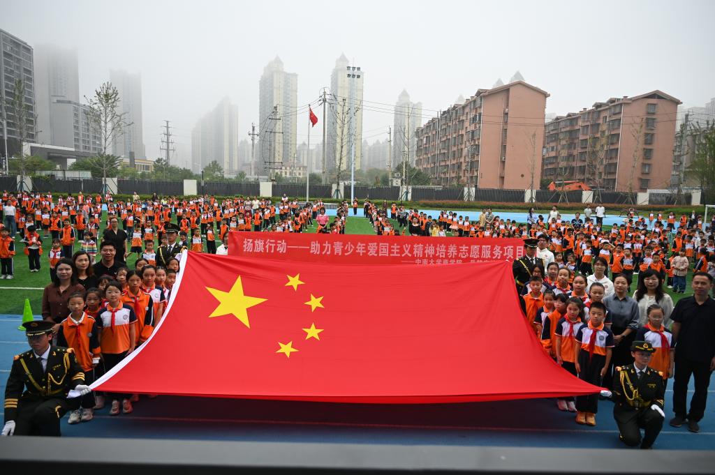 9月29日,晨光初透,湖南湘江新区岳麓实验谷山小学的操场上,一面长5米、宽3.3米的巨幅国旗在师生注目下缓缓展开。这面由北京市人民政府天安门地区管理委员会赠予伟德国际1949手机版、曾于2010年在天安门广场冉冉升起的国旗,而今成为连接大学与小学、历史与未来的精神纽带。