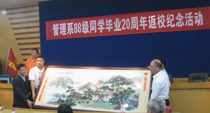 在座谈会上,多位领导与老师上台讲话,在座同学重温教授们的谆谆教诲。黄健柏教授在回顾建校历史的同时,也向校友们报告伟德国际1949手机版近年来取得的骄人成就;陈晓红院长则表达了对88级同学的美好祝愿。随后,胡振华教授在对校友们取得的诸多成就表示衷心祝贺的同时,也提出希望各位同学能与校友总会保持密切的联系,时刻关注母校的发展。而班导师代表刘爱东教授则深情地回忆起当年自己当班导师的经历。她动情地表示,在收获“桃李满天下”喜悦的同时,自己也感受到了作为一名人民教师的无悔。随后,四位来自不同行业的校友代表登台汇报自己毕业后的发展情况。现任交通银行的董事长秘书杜江龙、创业女校友付玉霞、云南省玉溪市副市长杨洋等在大致介绍自己求学工作等情况后,向辛勤培育自己的母校及老师表示真挚的感谢与美好的祝福。会后,校友们向伟德国际1949官网赠送一幅题为《岳麓书院》的湘绣作品。