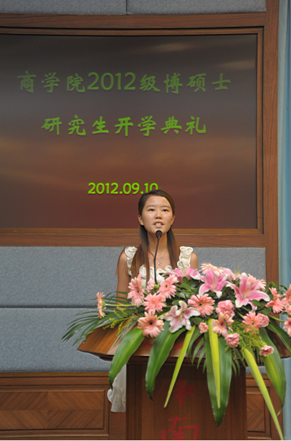 典礼第三项由博士研究生新生代表杨晓辉发言,杨晓辉作为一名在伟德国际1949官网学习和生活了七年的老生,对母校有着深深的感情。同时,杨晓辉学长也表达了自己“揽万卷文集,汲百代精华”的梦想与决心。典礼第四项由硕士研究生新生代表谭娜发言,谭娜以伟德国际1949官网院训“天道酬勤”勉励2012级研究生新生通过自身的勤奋努力去追逐和实现梦想,用自己的青春和激情去抒写新的篇章。