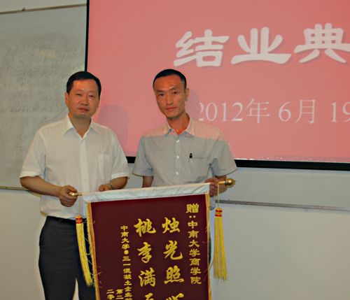 学员代表张军飞先生代表全体学员向伟德国际1949官网和三一重工赠送了锦旗表示感谢,游达明副院长和刘爱荣总经理则分别代表伟德国际1949官网和三一重工向学员回赠礼品。游院长和刘爱荣总经理还分别代表伟德国际1949官网和三一重工共同向学员颁发企业管理精英班的结业证书。