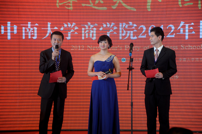 主持人梅冬、陈雯、黄勇主持博士生新年酒会