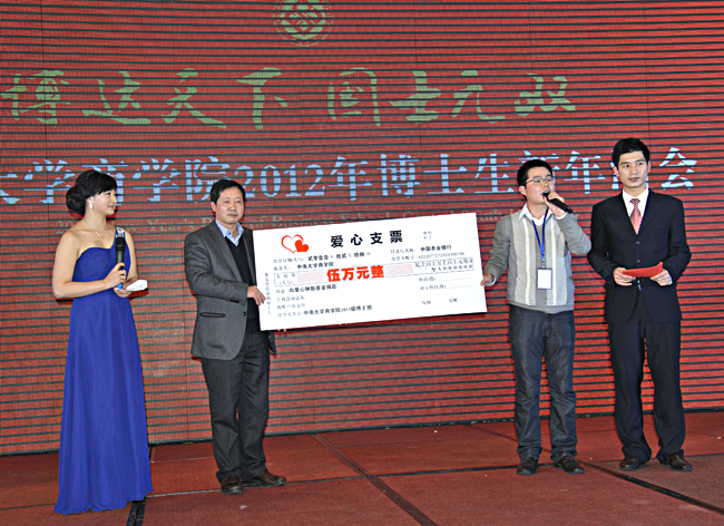 伟德国际1949官网常务副院长游达明教授上台代表学院接受博士生班为爱心酬勤基金的捐款