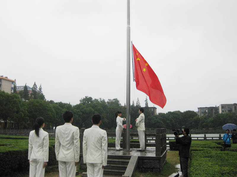 接着,由我们学子组成的国旗护卫队迈着整齐有力的步伐,以饱满热情的精神面貌走向升旗台。7时许,伴着雄壮激昂的国歌,鲜艳的五星红旗在升旗手手中徐徐升起,全体师生庄严肃立,共唱国歌。
