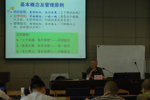 于教授首先从马斯洛需求层次理论谈起,介绍了不同层次的管理者需求,系统地讲解了其创新性的研究成果“管理层次论”。 于教授从管事、用人、建制、立言四个层面详细阐述了组织层级、治理结构和管理层次之间的关系。在授课过程中,于教授充分发掘了中国传统文化的精髓,将中国传统文化和现代管理理论结合起来,深入阐述了儒、道、佛、法各家的核心思想在管理中的应用,管理的至理名言,不同管理层管理者特别是高层管理者的为人处事之道,也讲述了许多管理学教与学的技巧。最后,于教授讲解了《法理经济学》的太极图新解和两线三区四分法,并且还穿插介绍了EMBA论文写作的规范及如何进行选题。