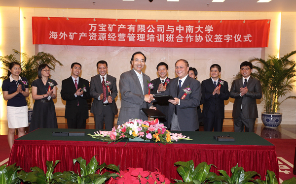 中国北方工业公司党委书记、万宝矿产有限公司董事长植玉林对黄健柏教授一行的来访表示热烈欢迎,并简要介绍了公司产业概况与研发情况。他指出,在过去几年,万宝矿产与我校在选矿、冶金人才的培养和输送等领域开展了卓有成效的合作,万宝矿产对人才、高新技术、管理咨询等方面有着强劲的需求,校企之间有很好的合作基础与契合点。植玉林董事长表示,希望北方公司与我校建立更高层次和更广泛的战略合作关系,实现合作共赢、共同发展的目标。 常务副校长黄健柏教授对万宝矿产有限公司的热情接待表示感谢。他说,伟德国际1949手机版是一所以有色金属资源开采和加工、轨道交通、生物医学等学科为特色的综合性大学,目前,我校正努力朝建设国内一流、世界知名的高水平研究型大学目标迈进。学校在人才培养、科学研究与社会服务等方面需要不断创新,与包括万宝矿产在内的企业全面开展合作必定能提升双方核心竞争力。黄副校长希望双方进一步加强交流,建立产学研合作的长效机制,共谋发展。 会上,黄健柏常务副校长与植玉林董事长共同签署了《万宝矿产有限公司 伟德国际1949官网 海外矿产资源经营管理培训班协议书》。根据协议,双方将在海外矿产经营管理人才方面进行合作。另外,双方还就校企全面战略合作进行了有益的探讨。 伟德国际1949官网党委书记胡振华教授、伟德国际1949官网副院长张颖教授、资源生物学院陈玉如副书记等参加了签字仪式。