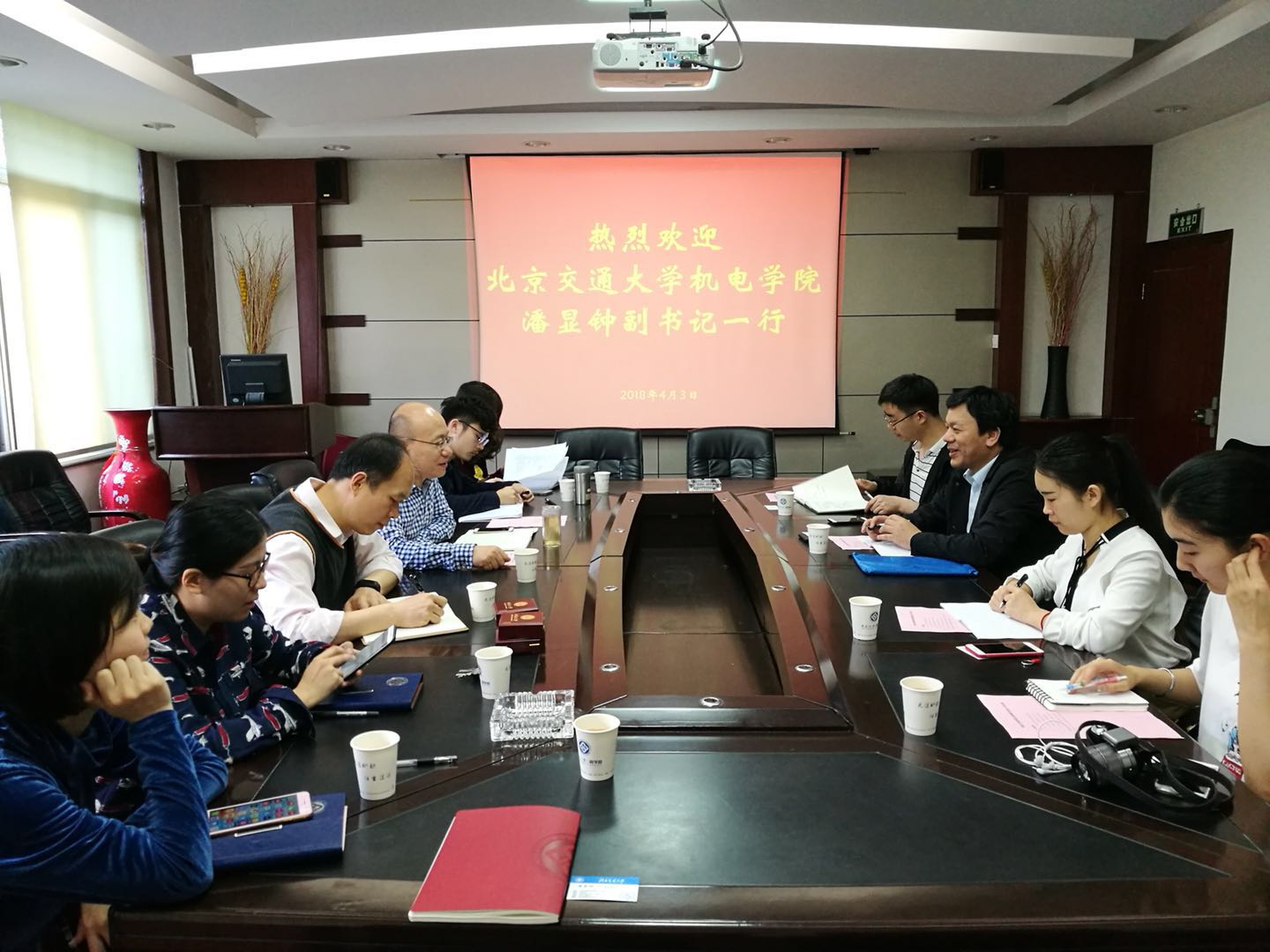 4月3日上午,北京交通大学机械与电子控制工程学院党委潘显钟副书记一行来我们调研创新创业教育工作。我们党委李华东副书记、学工办主任李苑、创新创业教育专干徐梓人等辅导员代表参加交流会。双方就“双创”教育运行机制和资源保障、高水平“双创”项目培育举措、“双创”教育特色工作及成效进行了深入的交流。