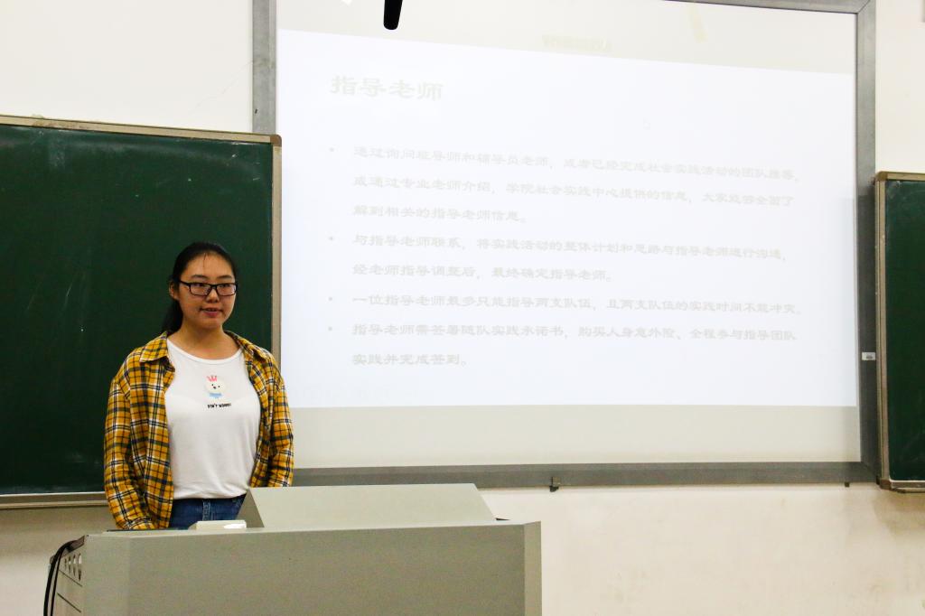 首先,社会实践服务中心丛静仪同学按照时间线向大家介绍了社会实践的具体流程,并提醒同学们在社会实践的过程中一定要注意做好详细的行程安排。